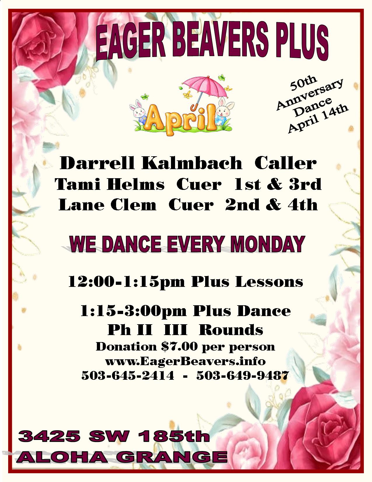 You are welcome to join us for Plus with Phase II and III Rounds at the Aloha Grange every Monday afternoon from 1:00 to 3:00. For current dancing information, please see our website at https://EagerBeavers.info. (see link above).