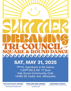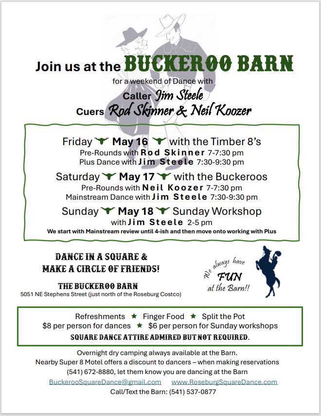 May will start with a Cinco de Mayo Dance on the 5th featuring Darrell Kalmbach calling Plus with Tami Helms cueing, then with lots of great dancing in between, ending with our Memorial Day Dance on the 26th, featuring guest caller Daryl Clendenin and Lane Clem cueing Phase II and III Rounds.