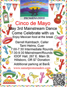 For May, the Sunset Promenaders will have a Cinco de Mayo mainstream dance on May 3rd. Mexican themed foods will be served. Darrell will be calling, and Tami will be cueing. Get your colorful dancing clothes out and join us for a fun evening!