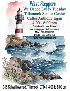 Wave Steppers dance at the Tillamook Senior Center from 4-6pm on Tuesday each week. Our caller is Anthony Egan. The address of the Tillamook Senior Center is 316 Stillwell Avenue, Tillamook. Located on the corner of 4th and Stillwell there is no on site parking and little street parking. The huge Safeway parking lot is directly across the street. Our dances are held weekly on Tuesdays from 4:00 to 6:00 and we always have food and snacks.