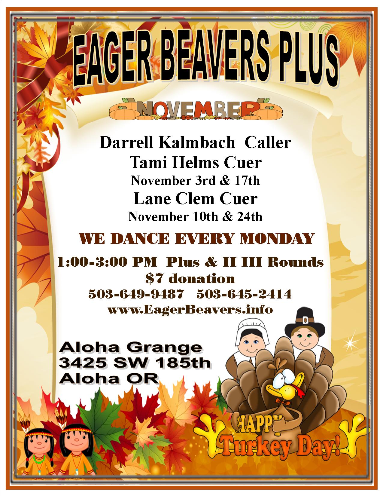 You are welcome to join us for Plus with Phase II and III Rounds at the Aloha Grange every Monday afternoon from 1:00 to 3:00. For current dancing information, please see our website at https://EagerBeavers.info. (see link above).
