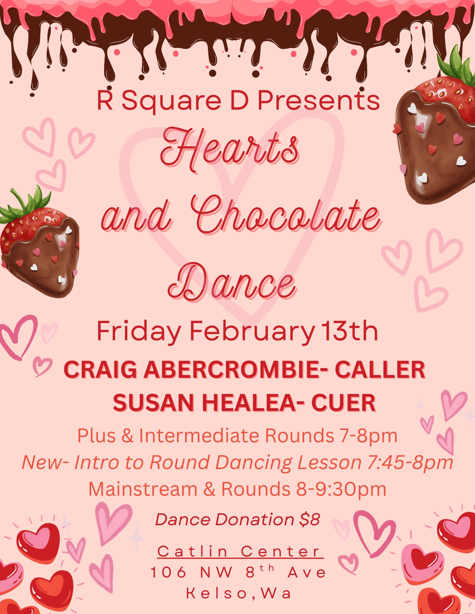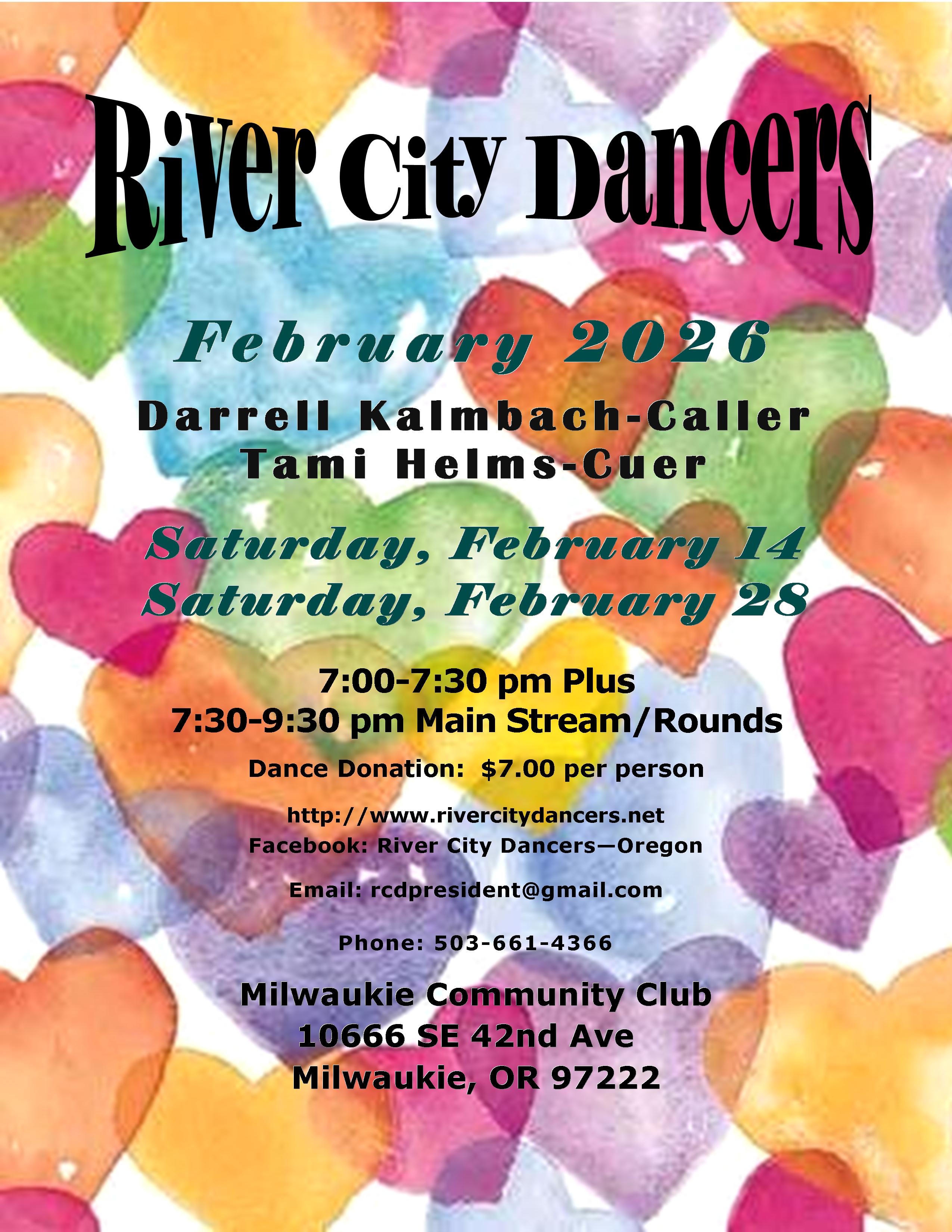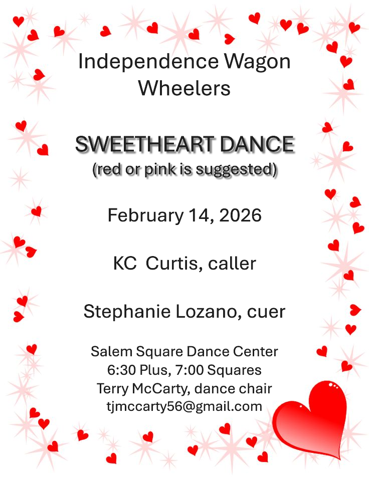 Start celebrating Valentine’s Day early! Bring your sweetie and join your friends at our Valentines dance on February 4. Deck yourselves out in red or pink. Darrell Kalmbach will call, and Tami Helms will cue.