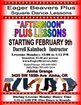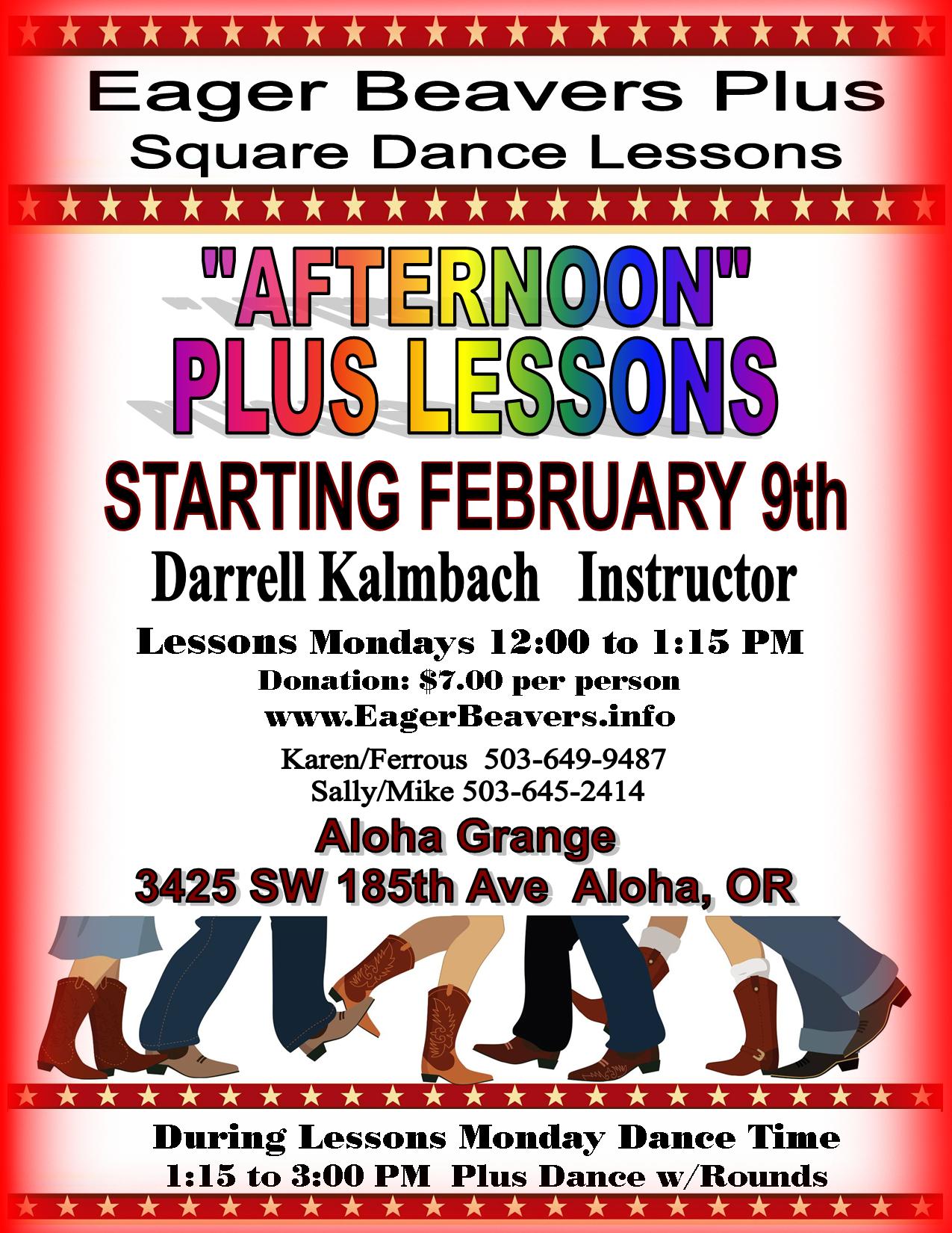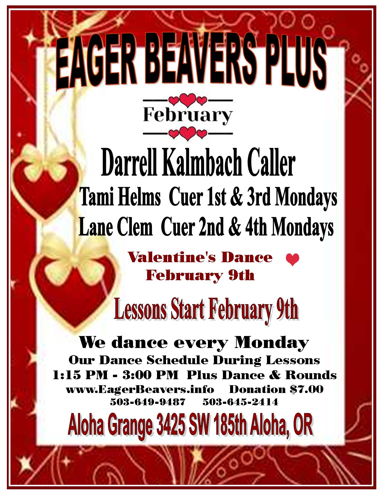Come join us for Plus with Darrell Kalmbach calling, and Phase II and III Rounds featuring Tami Helms and Lane Clem on alternate Mondays at the Aloha Grange from 1:00 to 3:00. For current dancing information, please see our website at https://EagerBeavers.info. (See link above).