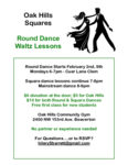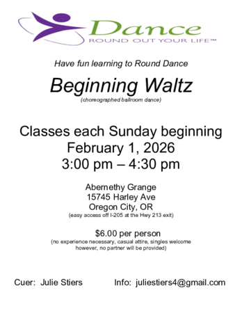 We welcome anyone who would like to learn Round Dance Waltz to join cuer Lane Clem as he teaches new students beginning February 2nd, Mondays 6-7 pm. Square dance lessons continue 7-8 pm with Mainstream dancing 8-9 pm. $6 donation at the door; $5 for Oak Hills members ($10 for both Round & Square Dances). Free first class for new students, Held at Oak Hills Community Gym, 2400 NW 153rd Ave. Beaverton. No partner or experience needed. For questions or to RSVP send email to Hilary, hilarySbarrett@gmail.com.