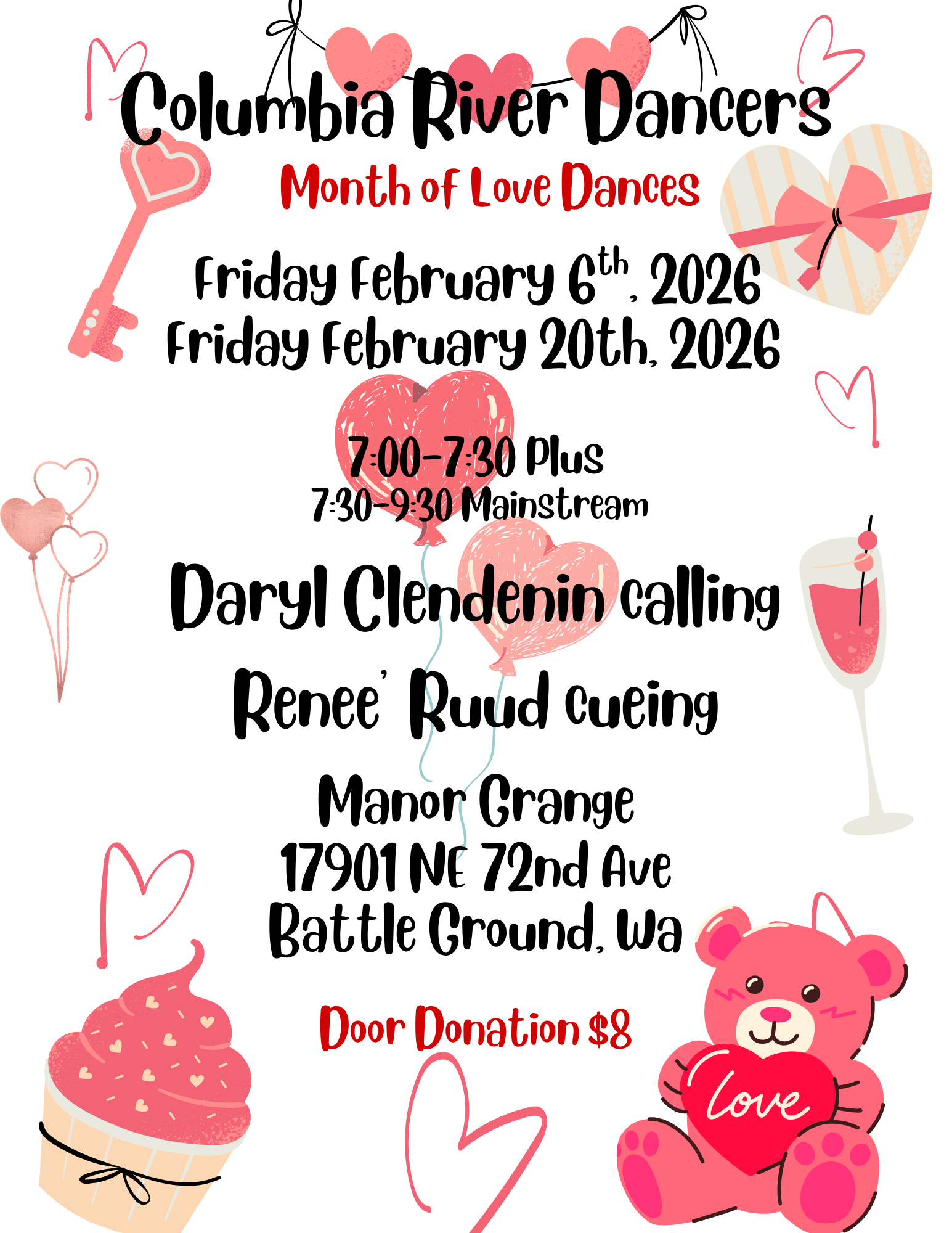 All dances are held at the Kinton Grange in Beaverton, beginning at 7:00 PM with Rounds and Plus, followed by Mainstream at 7:30 PM.