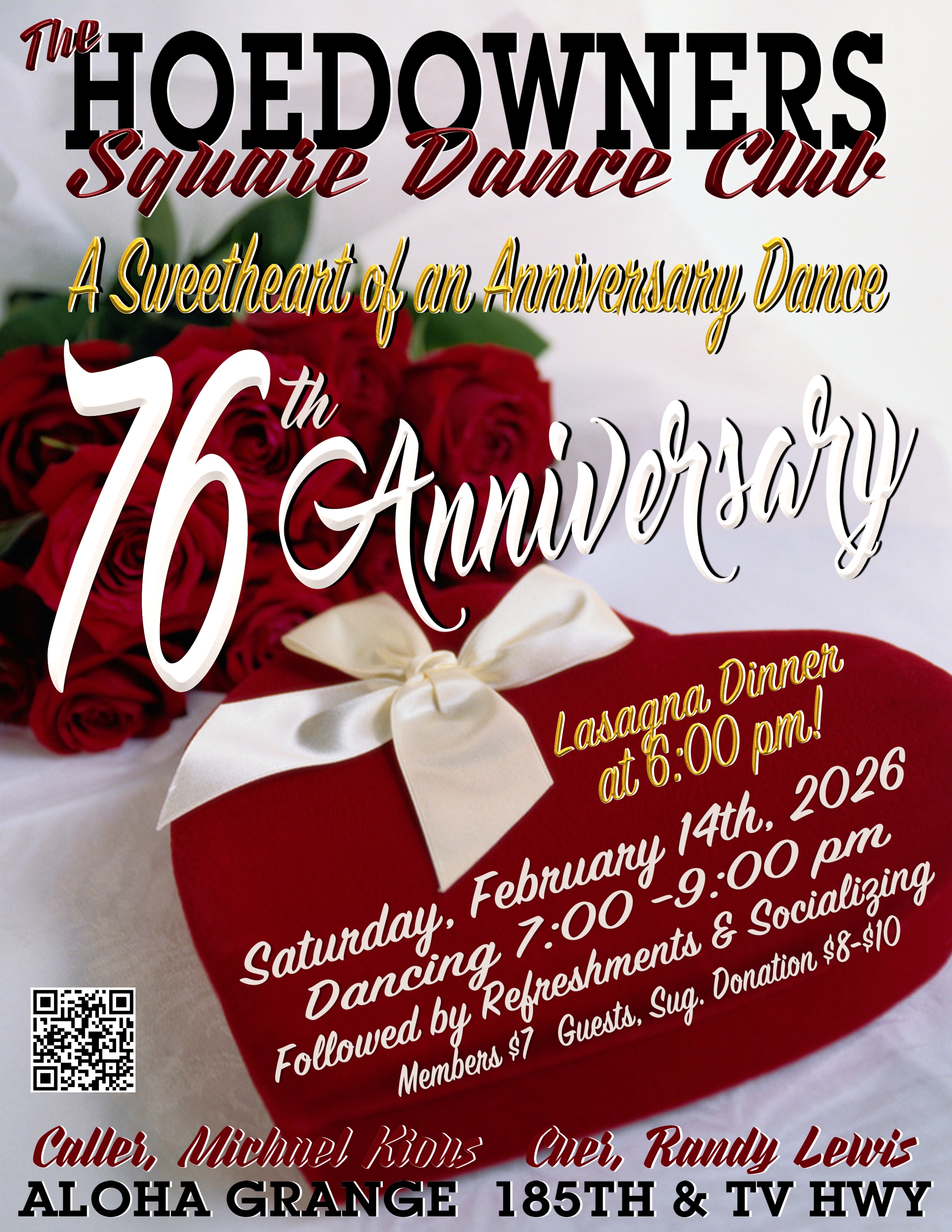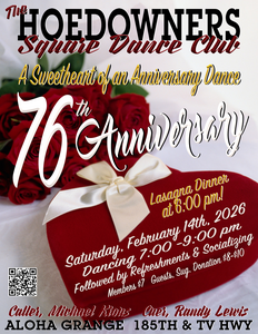 The Council strongly encourages all TVC dancers attend the anniversary dances held by other member clubs. On February 14th the Hoedowners will hold their 76th Anniversary dance at the Aloha Grange from 7:00 to 9:00, Michael Kious calling and Randy Lewis cueing. A lasagna dinner precedes the dance at 6:00. See Hoedowners flyer in the "Flyers" section of the OFN.