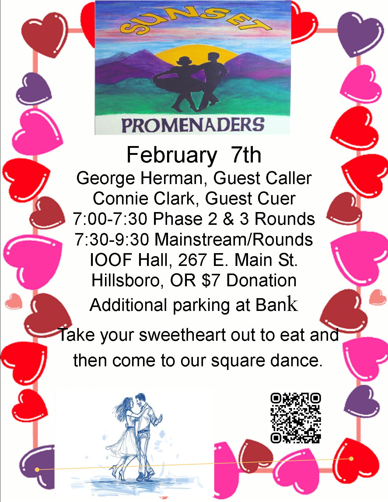 • Club Mainstream dance on February 7th will have a guest caller, George Hermann and a guest cuer, Connie Clark with a Valentine dance theme.