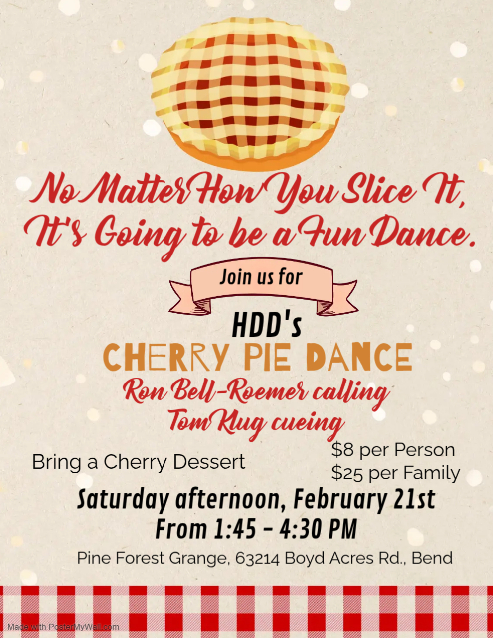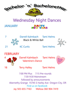 We invite you to our February 19 dance at 5:00 p.m. at the McMinnville Grange. Bruce and Judy will be back.
