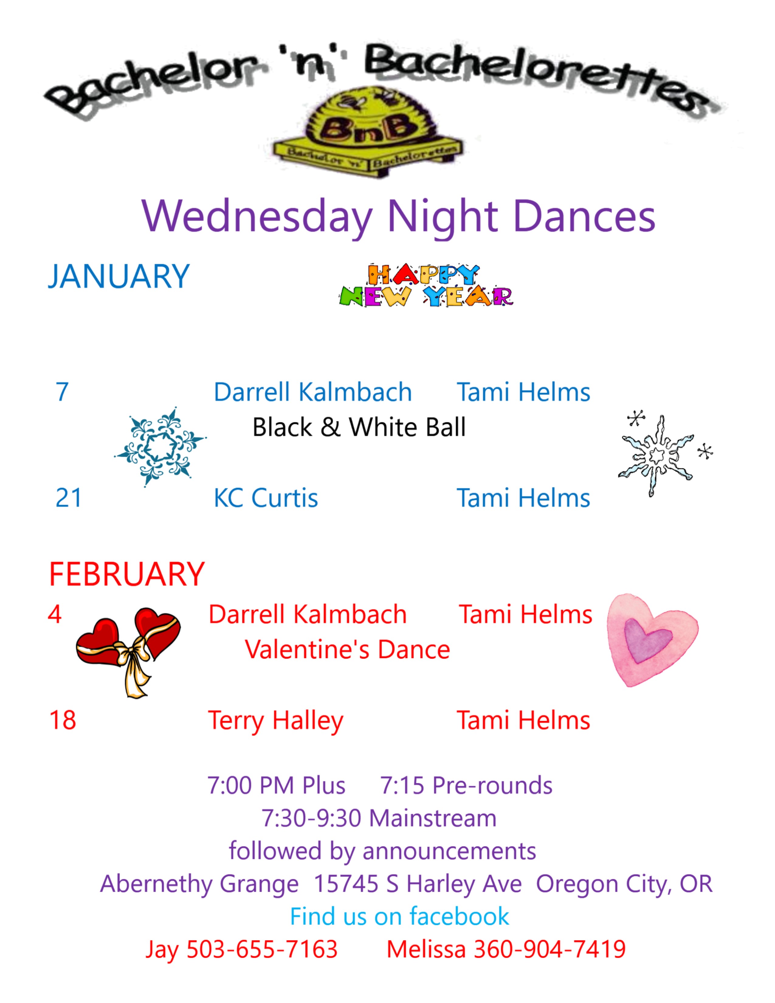 B’n’Bs dance first, third, and fifth Wednesdays at Abernethy Grange, 15745 S Harley Ave. in Oregon City. The format is 7:00 Plus, 7:15 Rounds, and 7:30 - 9:30 Mainstream. Announcements occur after the last tip. You can find us on Facebook, or call Jay 503-655-7163 or Melissa 360-904-7419.