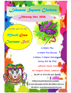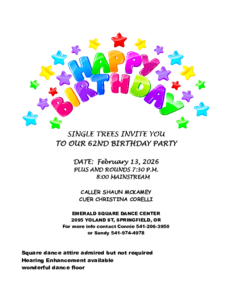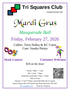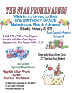 • February 21st is a “President’s Day” theme, Darrell Kalmbach calling and Tami Helms cueing. We are planning to serve pies at the 9:30 refreshments break.