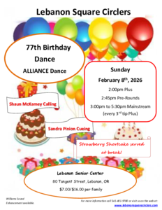 Our Coast Weekend will be the second weekend in March. We love to host new and old friends from other clubs for a fun time. Friday night caller will be Shaun McKamey, and Saturday night, Bruce Lowther. Judy Russell will cue both nights. Dancing starts at 6:45 p.m. each night. We will have a potluck lunch on Saturday at noon, followed by games until 2:30. All activities are at Gleneden Beach Community Center. Lodging and camping options are plentiful in the area, from Newport to Lincoln City.