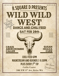 February 13th is a “Hearts & Chocolate” dance with Craig Abercrombie calling and Susan Healea cueing. There is likely to be much chocolate included in the refreshments that night! Our second dance in February is on 28th with the theme “Wild, Wild West!”, and again will feature Craig and Susan calling and cueing. Prior to the dance, at 6:00, we will have a chili feed at no extra cost. We encourage guests to enjoy the meal and then dance off some calories throughout the night!
