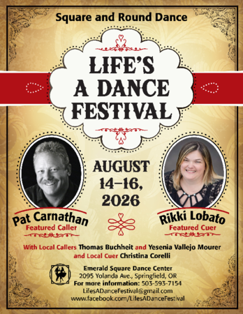 We are holding our two dances a month in January on the 1st and 3rd Sunday. In February, we will continue this pattern once again dancing on the 1st and 15th, with the dance on the 15th at the A1 level so our advanced class can join us and get some more floor time. In March again we will have dances on the 1st and 15th with the 15th at the A1 level with the class invited to join us again. This time we will have a live caller, Kris Jensen from Albuquerque, NM, calling to give the class and us a real treat. Please consider coming to join us at any of these sessions. We dance from 1:30 to 3:30 at the Emerald square Dance Center, 2095 Yolanda St. in Springfield in Hall B which is located behind the building. We are always casual and refreshments are available.