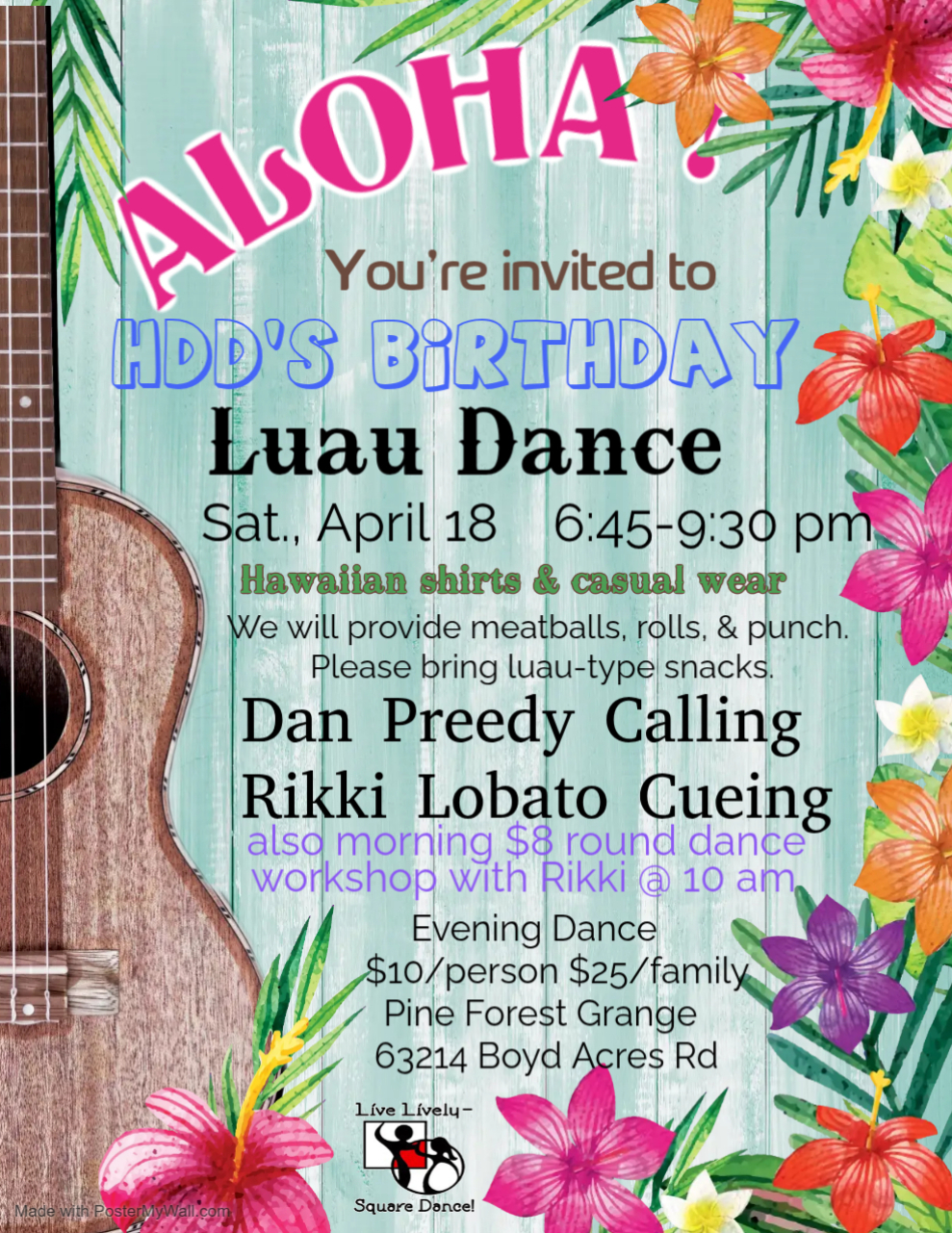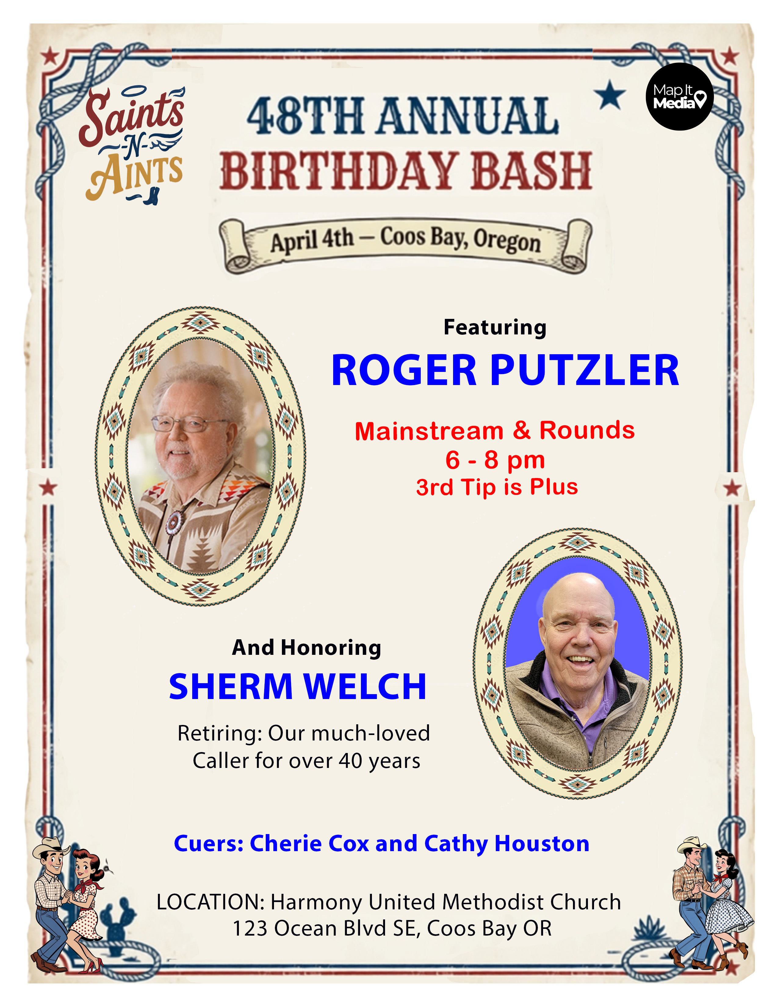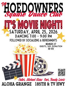 • Saturday April 25th Night at the Movies: Lights… camera… square dancing! We’re rolling out the red carpet for a blockbuster night where YOU are the star. Dress as your favorite movie character, wear your best Hollywood glam, or just show up ready for a night of cinematic fun. With Michael Kious Calling and Randy Lewis Cueing, at the Aloha Grange beginning at 7PM. Join us as the choreography will be smoother than a classic film reel and the fun guaranteed!.