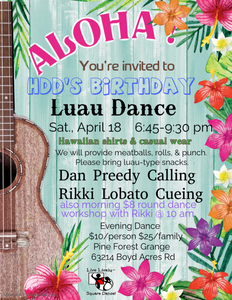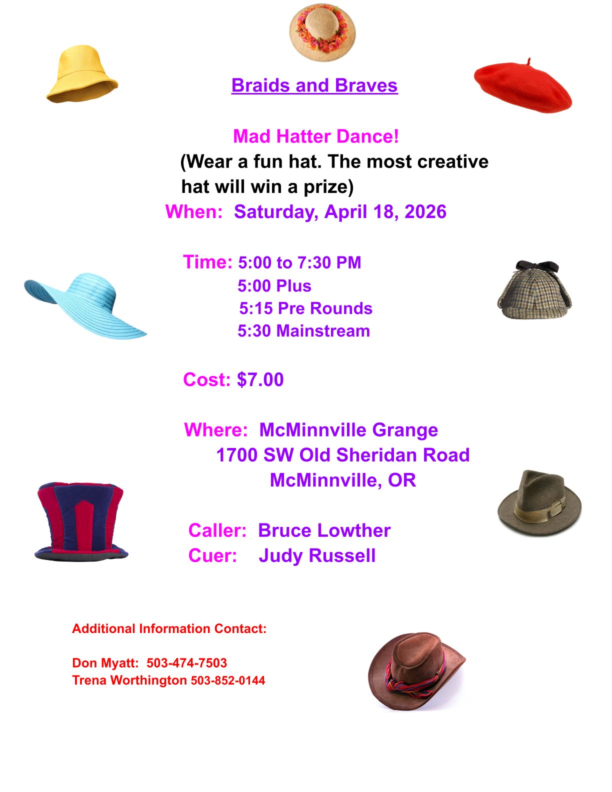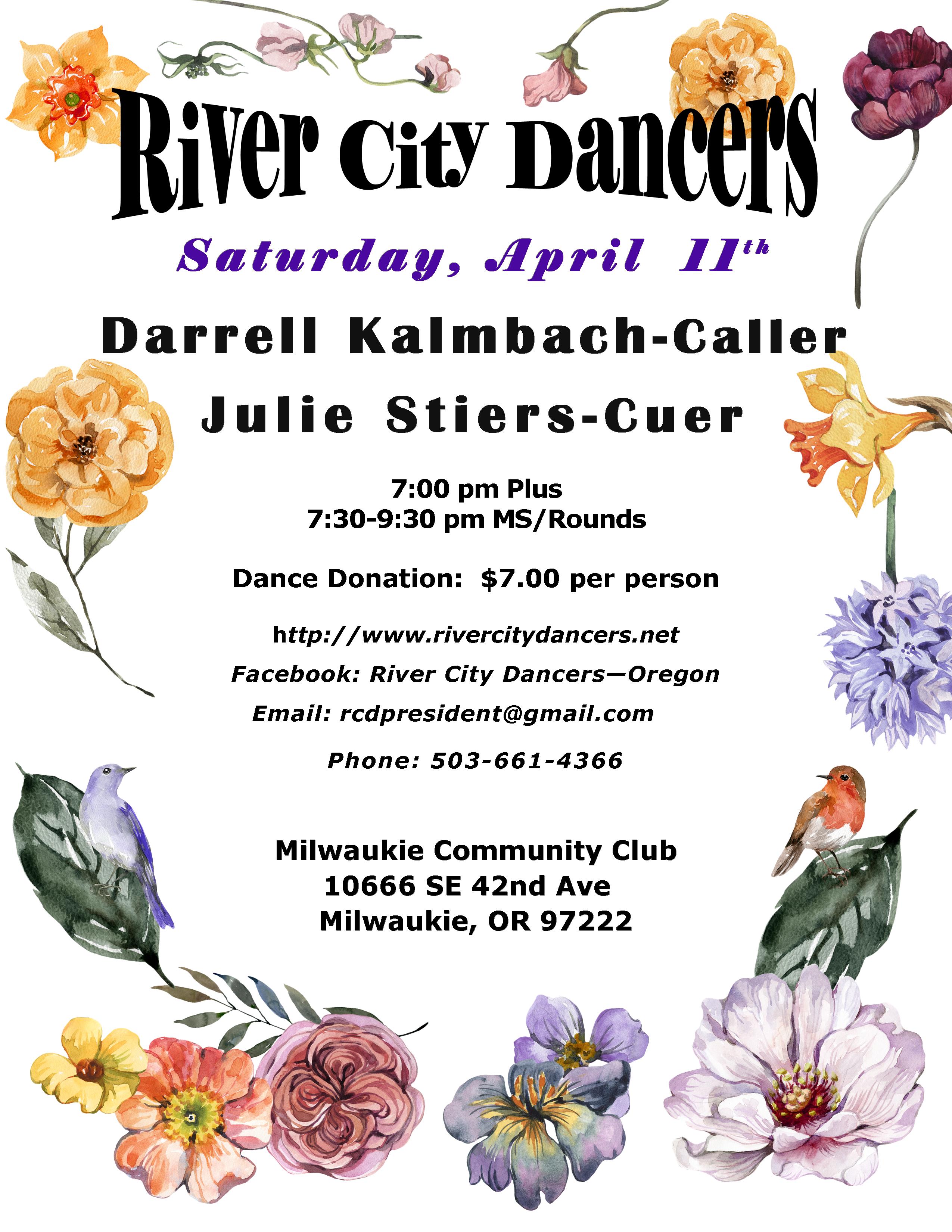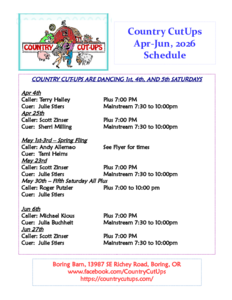 • Saturday, April 11th Spring Fling: Shake off the last of winter and twirl straight into spring! Think bright colors, happy feet, and that “the world is waking up again” energy. Michael Kious will be Calling, Randy Lewis Cueing at the Aloha Grange beginning at 7PM. The whole night will feel like a bouquet in motion. Come ready to dance, laugh, and celebrate the season Hoedown‑style!
