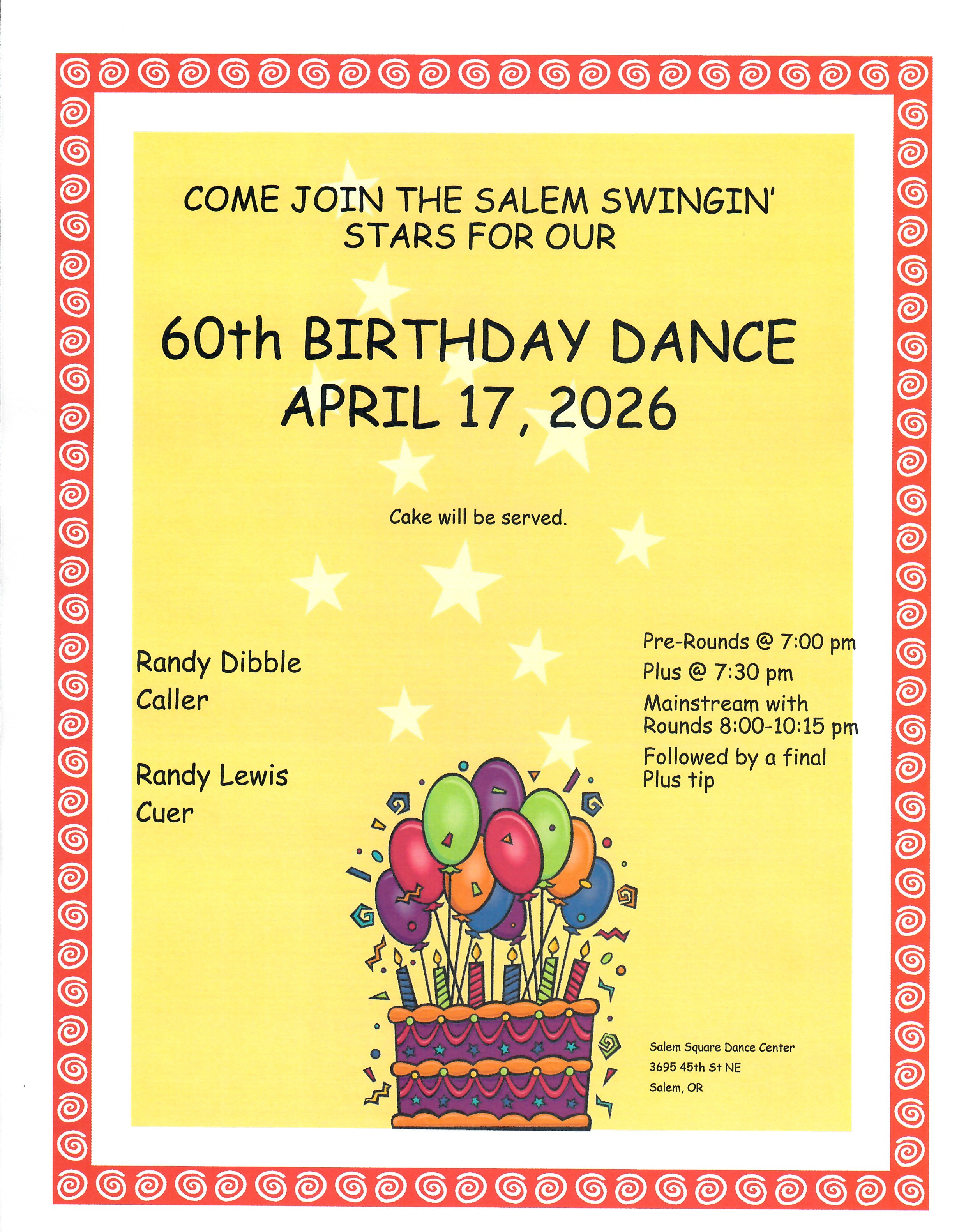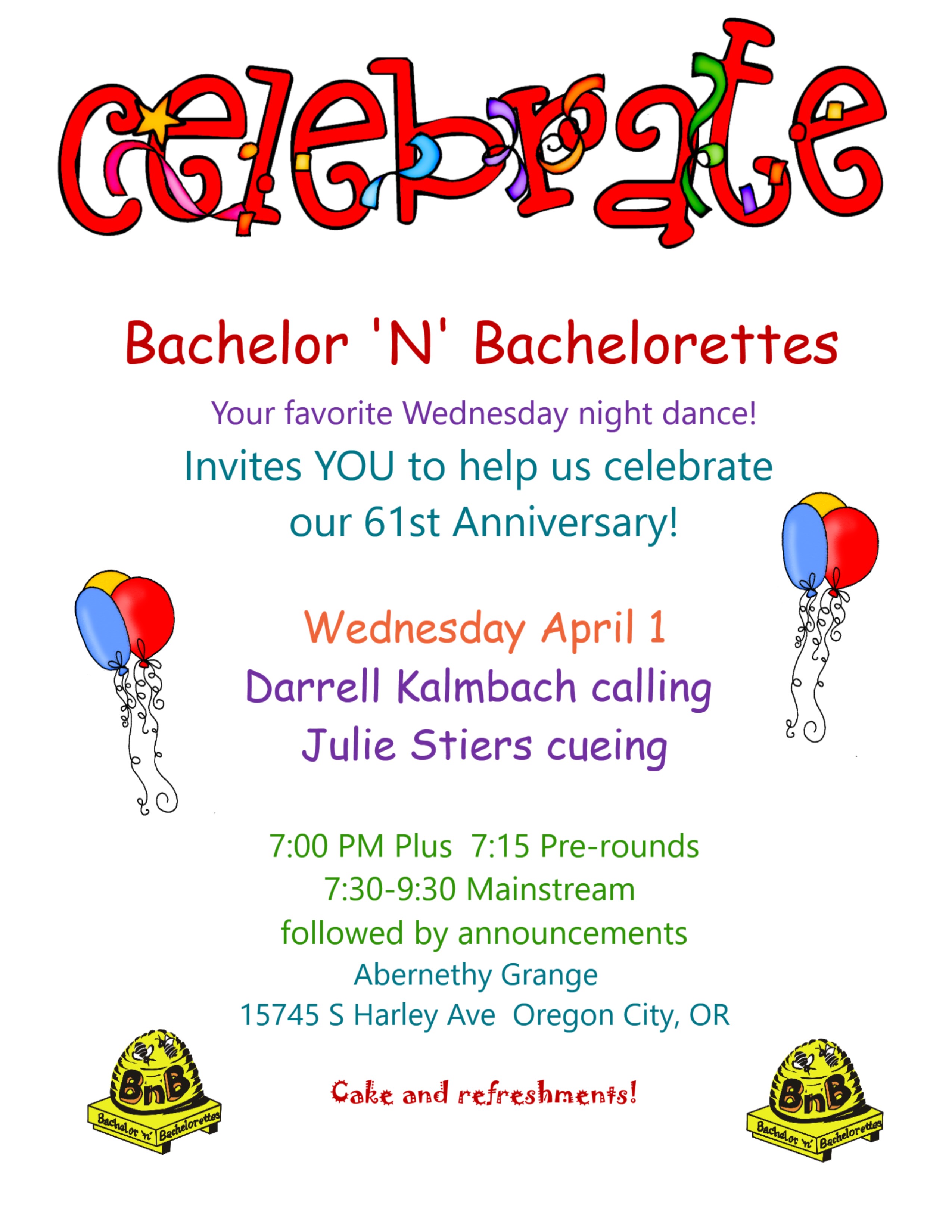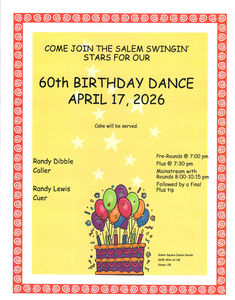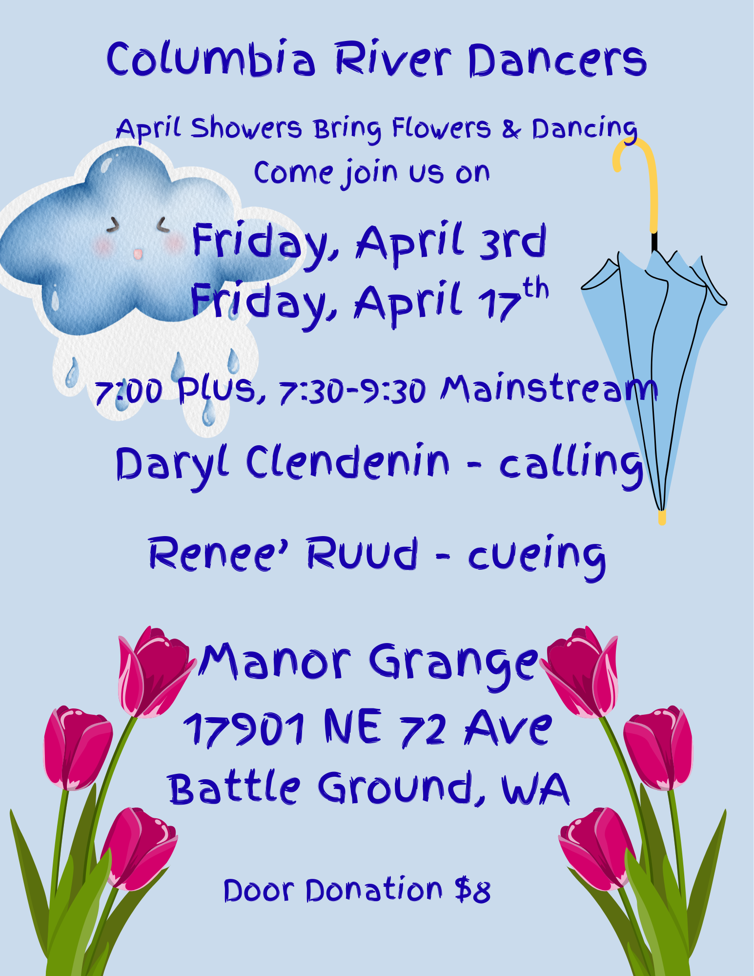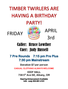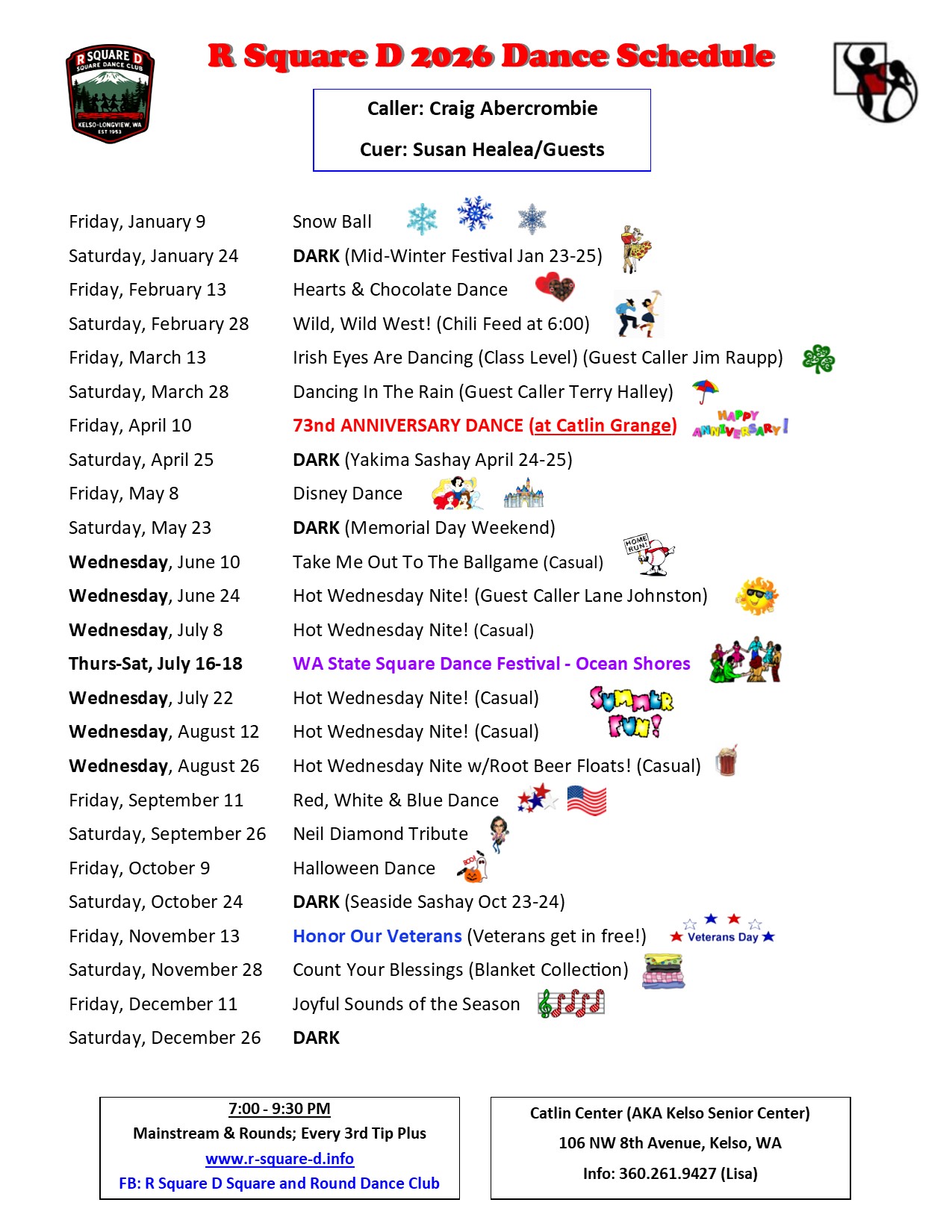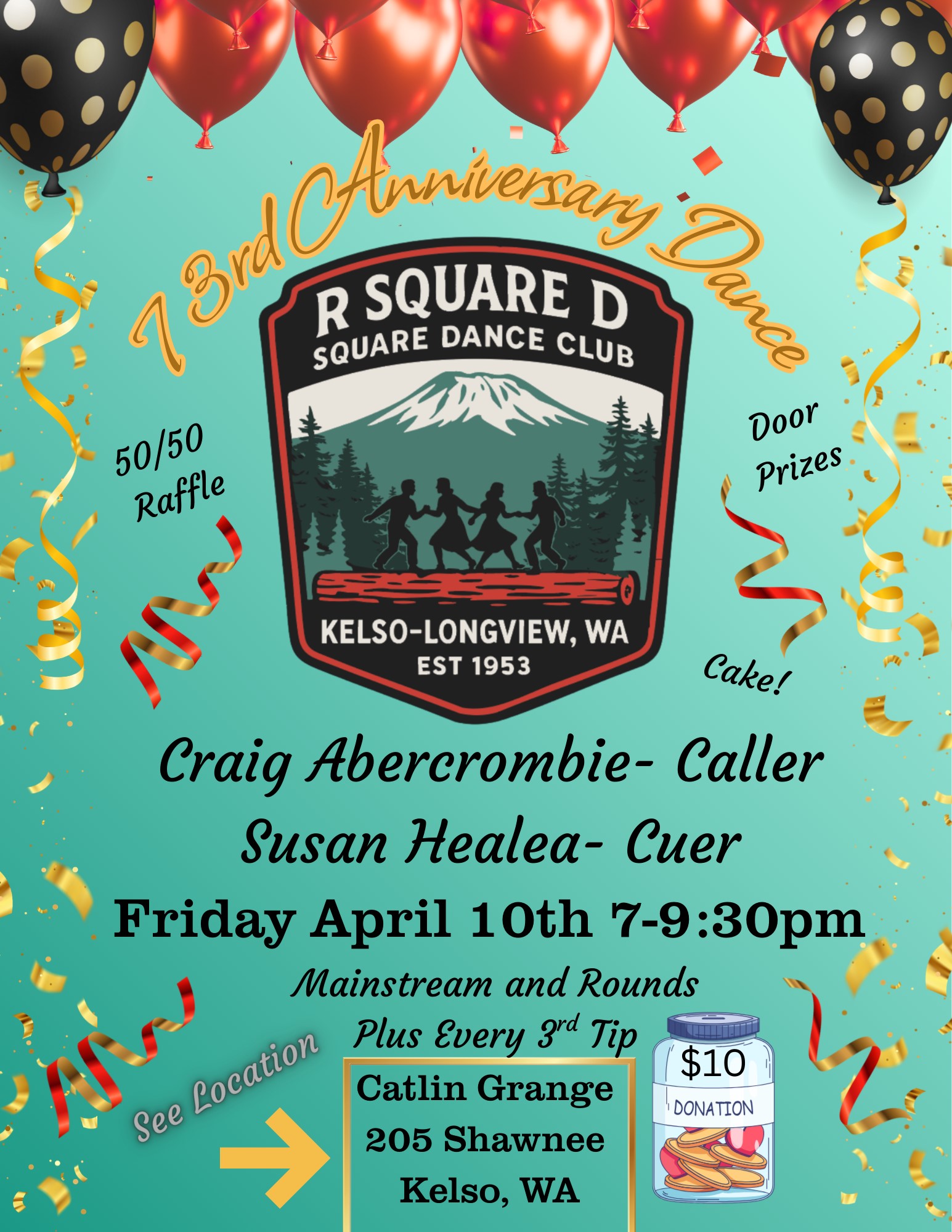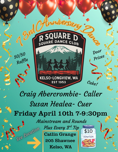 R Square D’s 73rd Anniversary Dance will be Friday, April 10th, with Craig calling and Susan cueing that night. Please note that this dance will be held at Catlin Grange in Kelso, instead of our usual location. The grange will accommodate more dancers, as we usually have a much larger attendance for our anniversary dances. We hope to see many of our dance friends there!