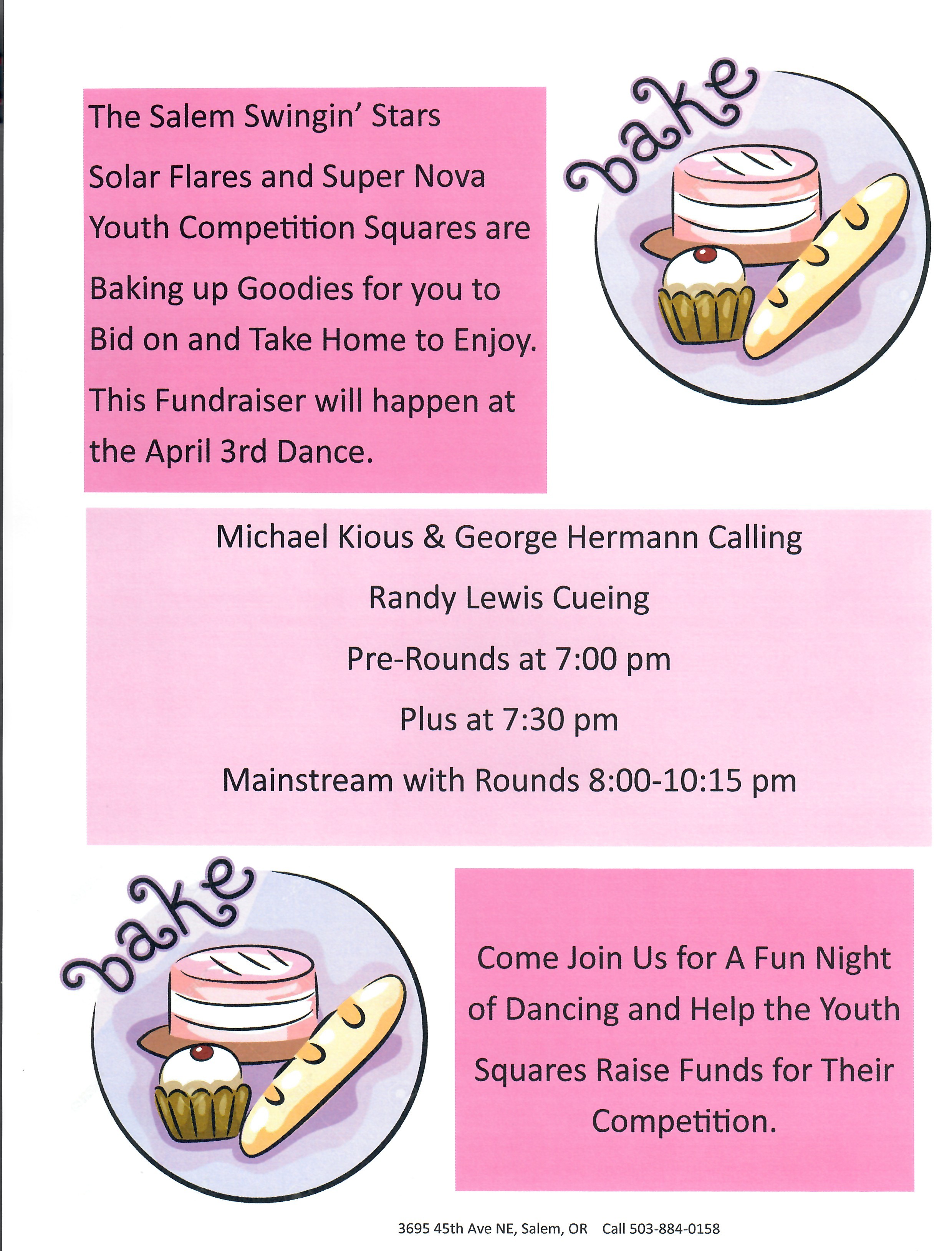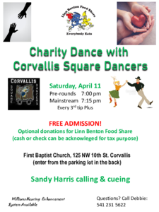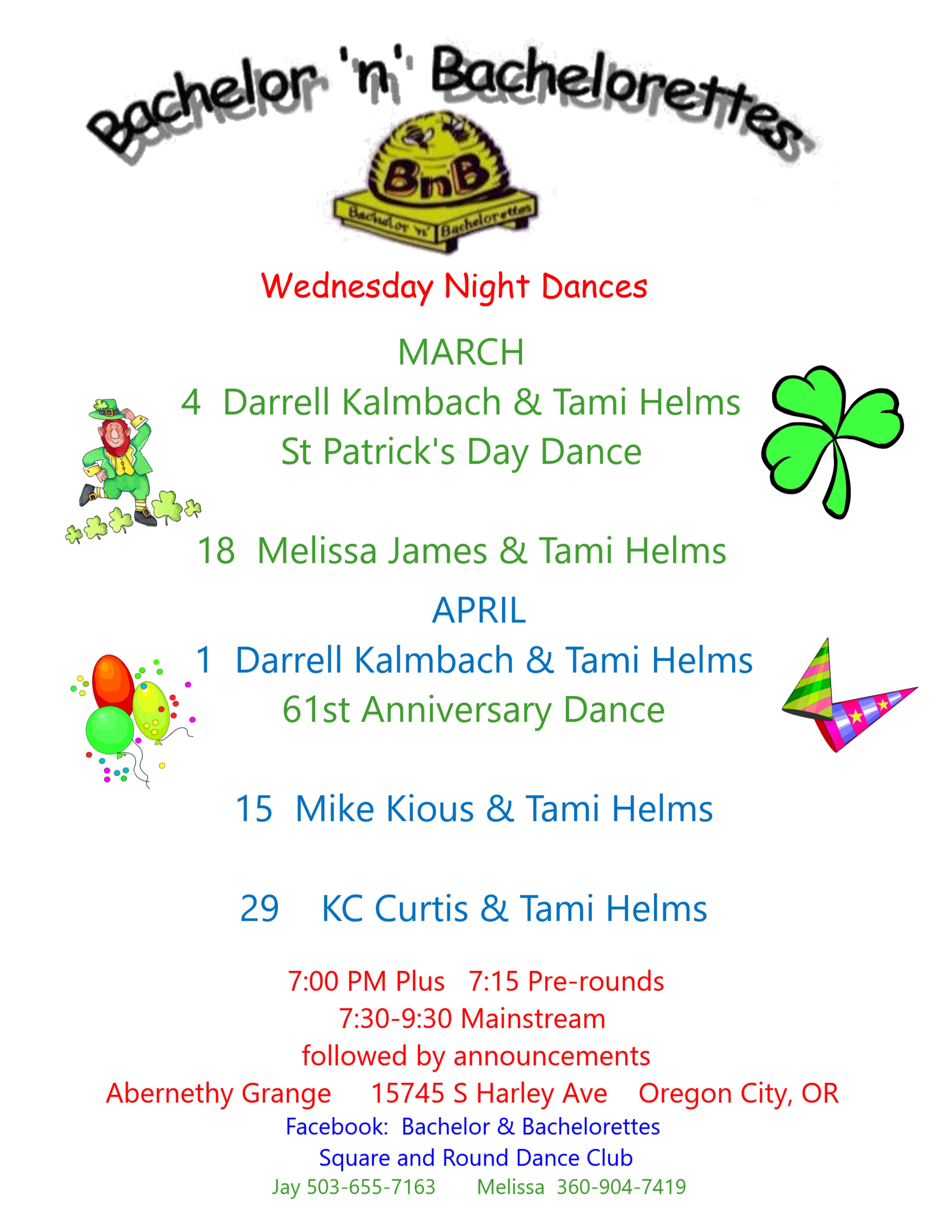 Spring begins with our March 20 Open Mic night with MCs Thomas Buchheit and Katie Marteny announcing youth callers and cuers from the floor, starting at 7:30pm. It’s their chance to have a little fun with an enthusiastic audience. This is great practice, too, for the Pacific NW Teen Square Dance Festival (PNTSDF) happening at the Blanchet Catholic School in Salem: an evening of dancing on May 1 and competitions all day on May 2, followed by an evening of dance as winners are announced. Buy a button before May and get in free.