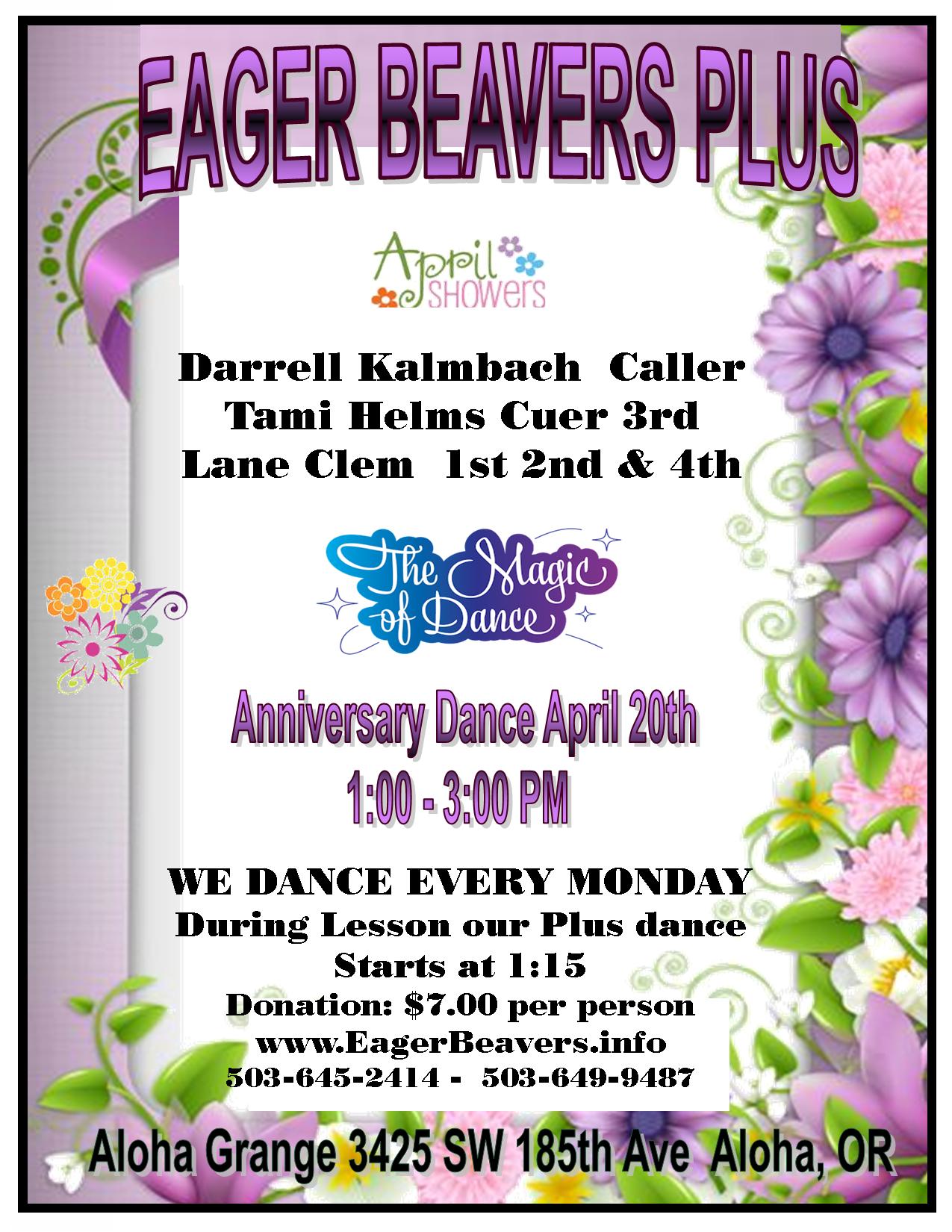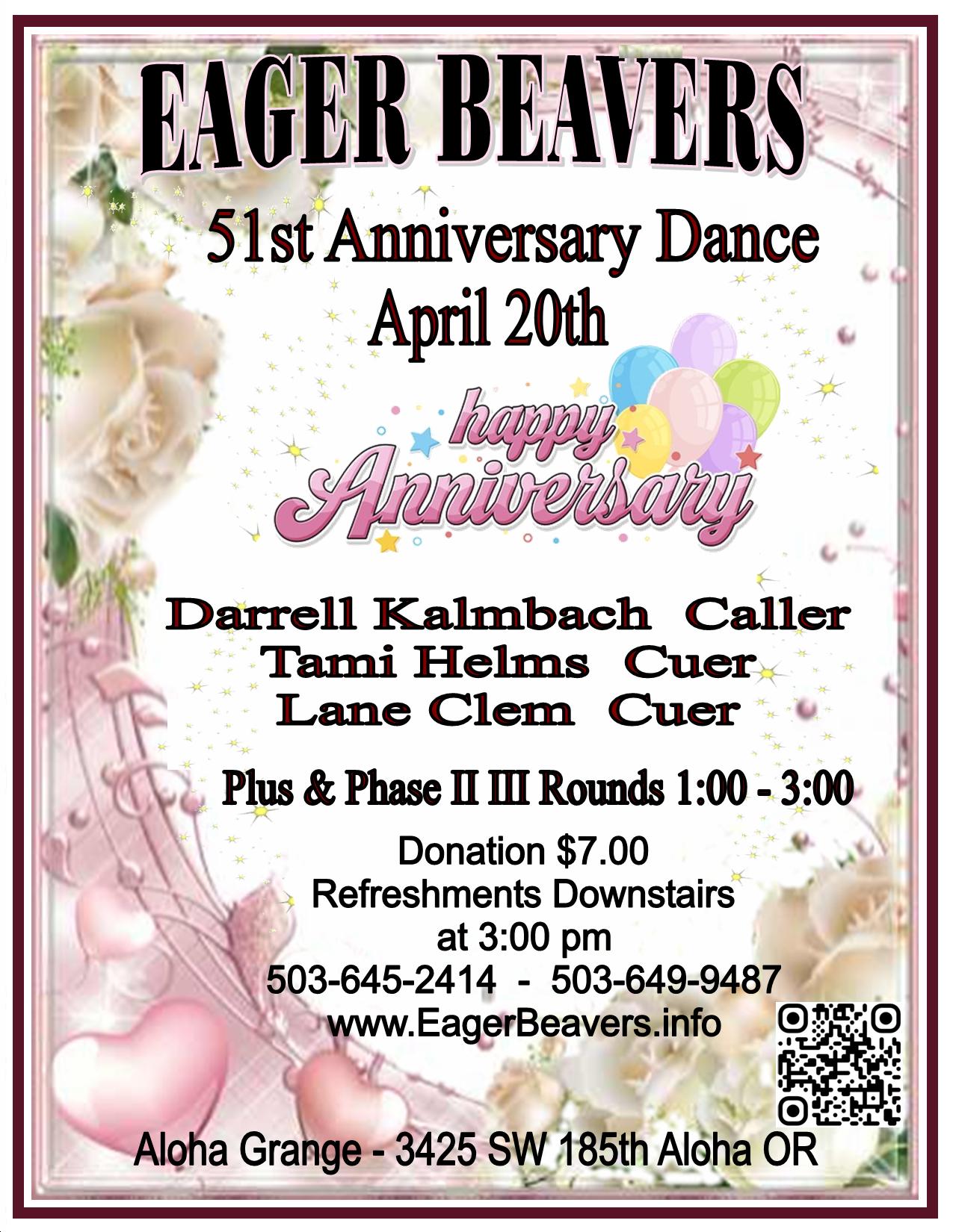 In April we’re preparing for a very special celebration: Eager Beavers’ 51st Anniversary Dance on April 20th from 1:00 to 3:00 p.m., with refreshments to follow. (We will not have a lesson that day.) Darrell Kalmbach will be calling, and both Tami Helms and Lane Clem will cue our rounds.