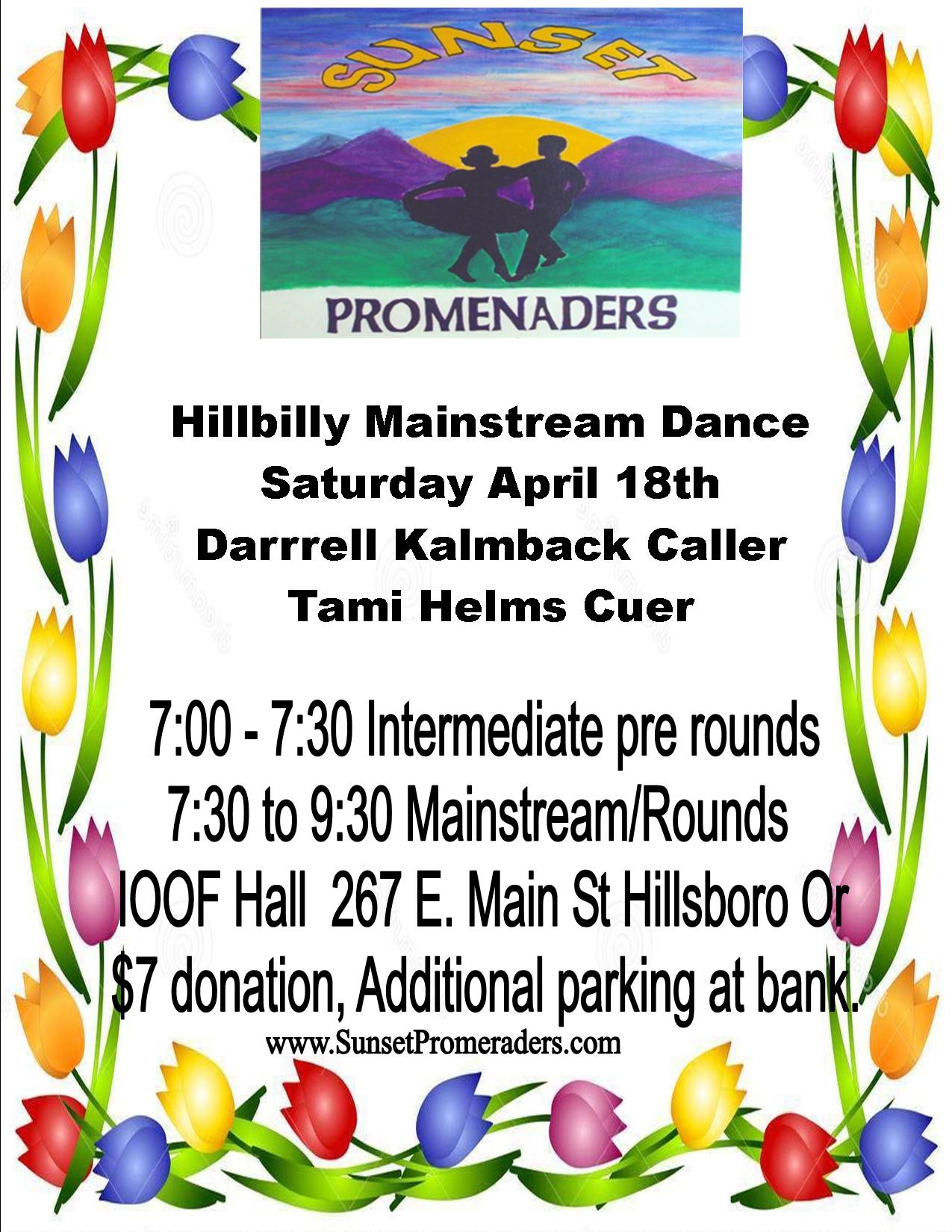 • Mainstream lessons are continuing through April into May on each Sunday, “Angels” are welcome; the times are 2:00 to 4:00 at the IOOF Hall in Hillsboro.
