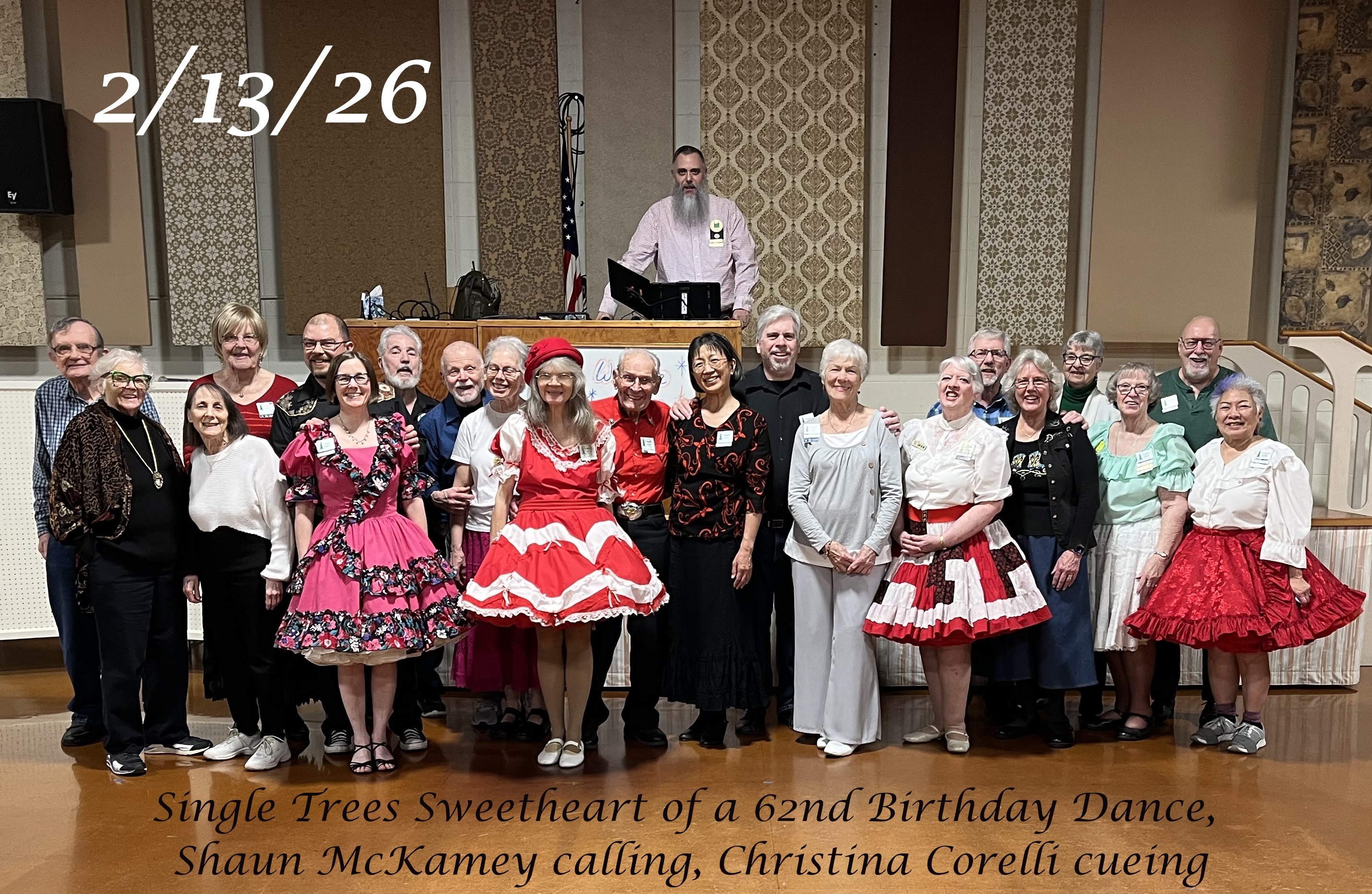 • 76th Anniversary Lasagna Dinner & Valentine’s Dance on February 14th. Our 76th Anniversary celebration, and a Sweetheart of a dance, was a tremendous success! The lasagna dinner was delicious, the hall was full of joy, and we were honored by visitations from both the Sunset Promenaders and Oak Hills, thank you for celebrating with us! A heartfelt thank‑you also goes to Roger Putzler, who stepped in at the last minute to call this important dance while our Caller, Michael Kious, was in the hospital.