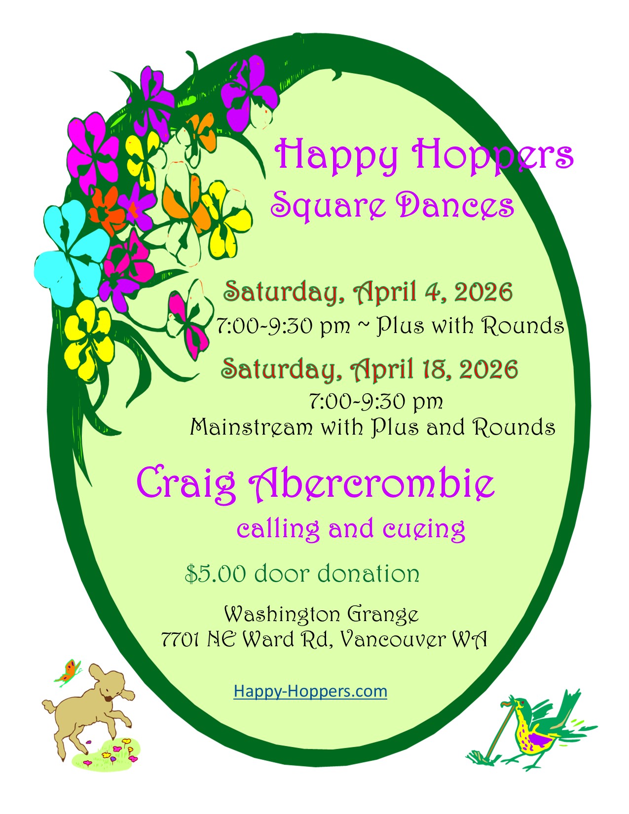 Happy Hoppers are providing March and April lessons on Monday nights: 6:30 Plus and 7:30 Basic/Mainstream. Club caller Craig Abercrombie started our new class on March 2. Due to Craig’s absence during the rest of the month, George Hermann and Terry Halley will continue the lessons. Craig will return in April to finish up. We plan on hosting a Beginner Dance on April 27: Plus at 6:30, Beginner/Mainstream at 7:30 pm. Everyone is welcome; bring your new dancers.