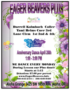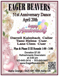 Come help us celebrate 51 years of friendship, fun, and fancy footwork, we can’t wait to dance with you! You’ll find us every Monday at the Aloha Grange, with Darrell Kalmbach calling and Tami Helms and Lane Clem cueing on alternate Mondays. For current dancing information, please see our website at https://EagerBeavers.info. (see link above).