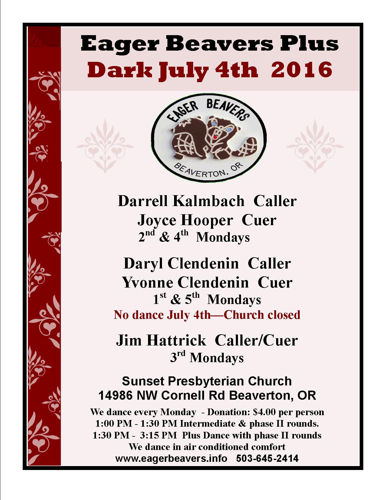 All plus dancers are invited to dance with us on Monday afternoons: Rounds 1:00 - 1:30 (Rounds will start at 1:15 during lessons); Plus 1:30 - 3:15 PM, Sunset Presbyterian Church, 14986 NW Cornell Road in Beaverton. We dance on most holidays too so if you have a day off come join us.