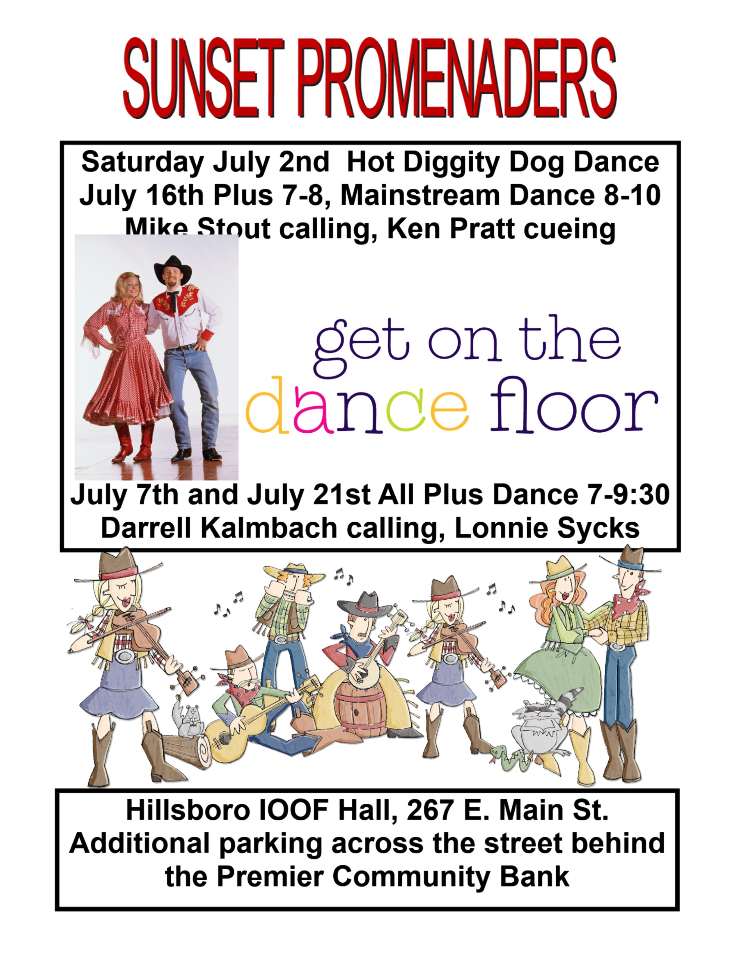 July 7th and July 21st are our Thursdays Plus dances with Darrell and Ken. The times are 7:00 until 7:30 Intermediate Rounds, 7:30 to 9:30 is all Plus Dance. For anyone not familiar to us we dance in the Hillsboro IOOF Hall at 267 E. Main St.