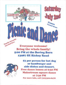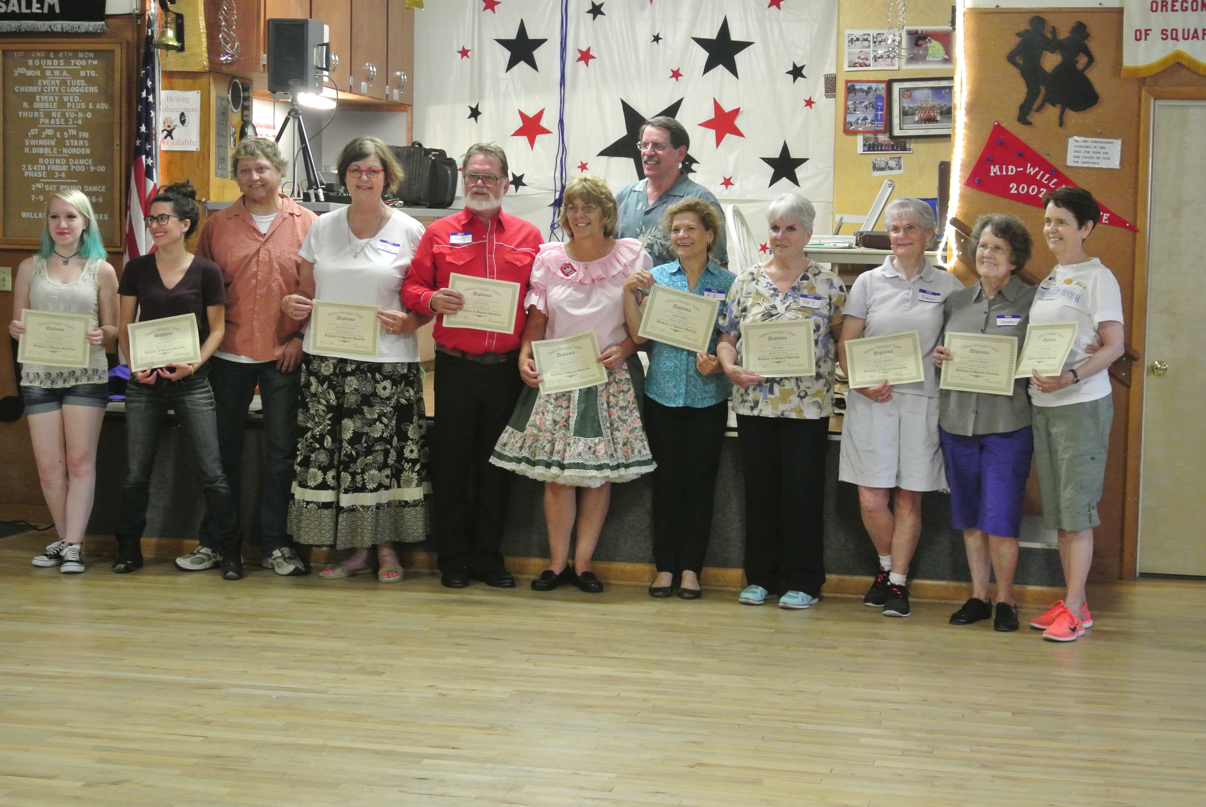 Our class graduated and celebrated with a Jamboree May 22nd. We have been encouraging new dancers in the area to join us for the first hour of our Saturday dances and had a decent turnout in May. Not only our new graduates, but folks from Columbia River, Oaky Doaks, Sunset Promenaders, Tri-Squares, Tualatin Timbers, Rosetown Ramblers and Hoedowners joined us May 7th and 21st. Such energy! Thanks to the folks from those clubs who encourage their new dancers to try these events out, and even warmer thanks to those of you who accompany them to support them in their squares. A familiar friendly face makes the adventure less daunting. The Saturday dances are progressive, so the tips get more challenging throughout the night.