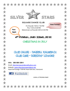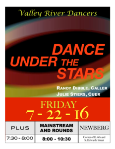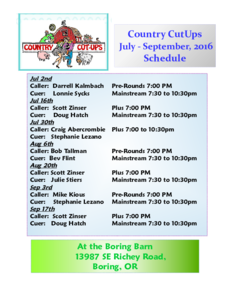 There was an error in my last report that needs to be corrected. Our club is planning to move our dance nights to 1st, 4th , and 5th Saturdays in 2017, not 2016. For now, we are at the Boring Barn, dancing every 1st, 3rd, and 5th Saturdays in 2016, with the exception of New Year’s Eve. This is a fifth Saturday this year, but it has been canceled. Sorry, for any confusion that error may have caused.