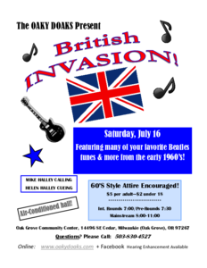 July 16: British Invasion Dance: We kicked them out once, but 200 years later they came back! The British Invasion of the 1960s brought a lot of fun fashion and Fabulous music. Caller Mike Halley will feature songs from some of the greats of that era, and we’ll be movin’ and groovin', square dance style. This is a regular dance beginning at 7PM with Intermediate Rounds, Pre-rounds at 7:30PM and Mainstream square dancing beginning at 8PM.