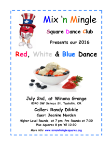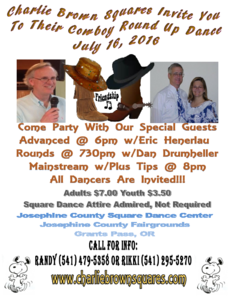 Our next dance is July 16th, and will truly be a wonderful party!!! We have special guest caller Eric Henerlau and cuer Dan Drumheller; both from CA. Advanced dancing starts at 6pm; Pre-Rounds at 7:30pm & Mainstream w/Plus tips from 8-10:30pm. We hope to have lots of our dancing friends come and enjoy this special dance.