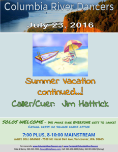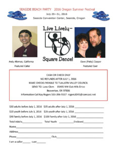 July 16 (3rd Sat)The 2016 Summer Festival, “Seaside Beach Party”, hosted by the TVC, will be July 29th through 31st at the Seaside Convention Center. The featured caller is Andy Allemao from California, and the featured cuer will be Dave and Patty Cooper. Additional calling by “The Crew”.