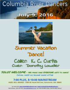 On our dance July 1st, we will celebrate KC’s birthday. It’s always a fun evening starting out with a BBQ at 6:30 p.m. downstairs at the grange and dancing away the evening to great music with KC and Bev leading the way.