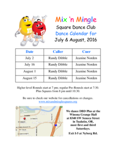 July 16 (3rd Sat)July 13th will be our Denim Dance with guest caller Steve Noseck and on the 27th Hot Summer Nights. August 10th is our Hawaiian Dance and then it’s back to school dance time on August 24th.