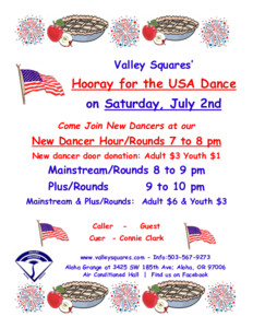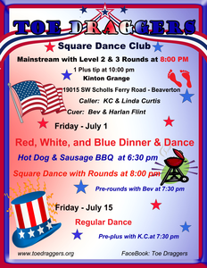 July 2nd will be our Hot Diggity Dog Dance and July 16th will be a regular dance, both with our club caller and cuer. Plus 7:00 to 8:00. Mainstream 8:00 to 10:00