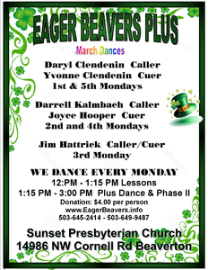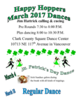 We will have our regular Plus dances on the first and third Saturdays of the month at the Clark County Square Dance Center, with our club caller/cuer, Jim Hattrick. For March, it's the 4th and the 18th. The 4th is our annual "Irish Potato Dance". Baked potatoes for everybody, with all the toppings! Pre-rounds start at 7:30, with squares at 8:00.