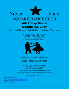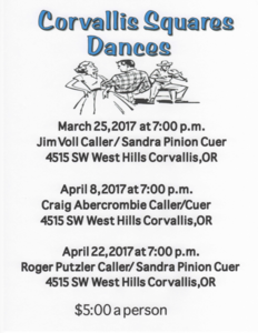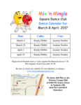Please attend our March dances on the 1st & 3rd Saturdays. Also the first Saturday in April is our Anniversary Dance called by Scott Zinser & cued by Connie Clark.