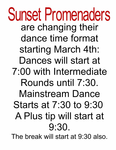We have changed our times and format a little, now we start the evening with Intermediate Rounds from 7:00 to 7:30, Mainstream Dance 7:30 to 9:30. There will be a Plus Dance tip starting at 9:30.