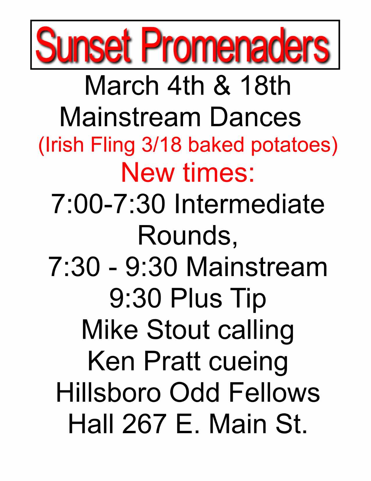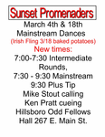 Our Sunset Promenaders mainstream dances are Saturdays March 4th, and 18th with Mike Stout and Ken Pratt calling and cueing and the theme for the dances is “Irish Fling”.