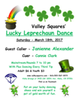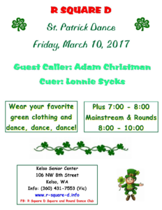 Hopefully come March, the snow and ice will have settled down so we can all get back to dancing. We bring in the month with a St. Patrick’s Dance on the 10th. Come on out and join us with some luck of the Irish, Pot of Gold, Leprechaun magic and music of our guest caller, Adam Christman.