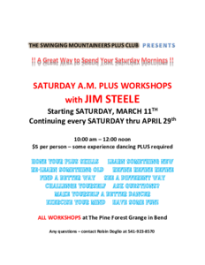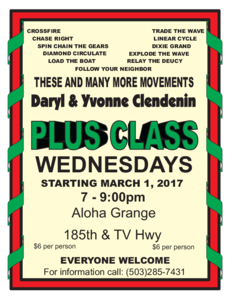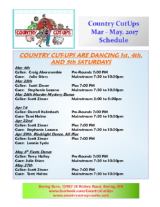 We are planning to start another Mainstream Class March 2nd, on the heels of graduating about a dozen new students at the end of February. We want them to come back as angels and solidify their skills and get a new crop of dancers started. Scott Zinser will be teaching and we will continue to meet on Thursday nights at the Boring Barn from 7:30 to 9:30 PM.