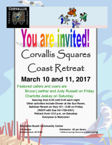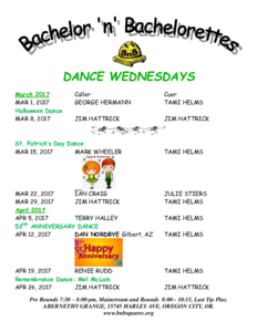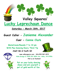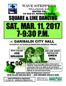 March 18 (3rd Sat)The Wave Steppers’ first dance of 2017, a St. Patrick’s Day dance, will be Saturday, March 11th on the big dance floor at Garibaldi City Hall, 107 6th Street (at Acacia), with club caller Joe Wrabek and the club’s line dance instructor, Gwen Kiel. (That’s the same weekend as the Championship Crab Races, one of the town’s biggest festivals.)
