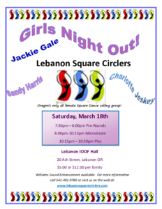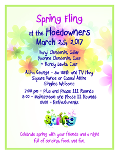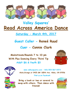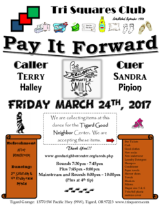It has been fun visiting clubs who dance on the 3rd Saturday since we changed our schedule. We visited the Happy Hoppers in January, and the Oaky Doaks in February. We will be going to the Valley Squares in Aloha this month. We will be holding elections in March at our General Meeting. This past year has gone by quickly!