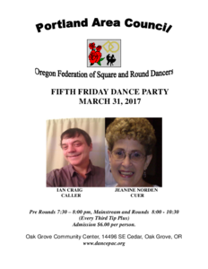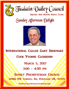 March 18 (3rd Sat)The next Council event will be "Sunday Afternoon Delight", dance on March 5th at the Sunset Presbyterian Church from 2:00 to 4:30. Gary Shoemake will be calling and Yvonne Clendenin cueing. Gary is a popular International Caller and this will be a very special treat for us. See the flyer below or on the Federation Facebook page. The Sunset Presbyterian Church is located west of Sunset High School at 14986 NW Cornell Rd Beaverton, OR 97229. Use the East entrance and parking lot.