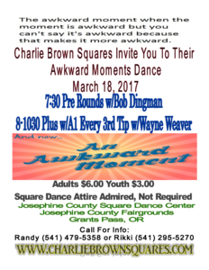 March 4 is our March Away The Blue MS/Plus dance with Ray calling and Mary Nutt cueing. March 18th is our Awkward Moments Plus/A1 Dance. Ray is out of town, so we have Wayne Weaver to help us through those awkward moments; as well as Bob Dingman providing the rounds.