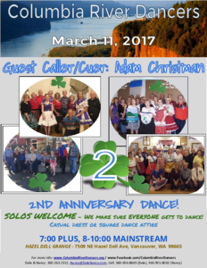 The other good news is we are getting ready to celebrate our 2nd anniversary in March. Adam Christman is coming over from Spokane to do the calling that evening so be sure to mark March 11th on your calendar. Remember that we dance plus from 7 to 8 and mainstream from 8 on. Our goal is to make sure everyone who attends gets to dance; therefore, we encourage singles to attend as well as couples.