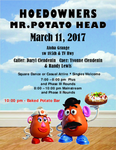 What’s in the Hoedowner future? On March 11th we’re having our Mr. Potato Head Dance with a baked potato bar to follow. The Potato Head family has spread their wings over the years and has left the modest homburg, mustaches and high heels behind. You can find them decked out in all sorts of outfits; super heroes, mermaids, storm troopers, pirates, moms and dads. We encourage you to come dressed as your favorite Potato Head.