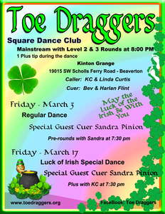 March brings on the luck of the Irish. We’ll be kicking up our heels on March 17th with the Luck of the Irish dance. March 3rd is our regular dance. We love our Kinton Grange and we hope to see you at many of our dances. Bev and KC pick out great songs for us, so there is always a fun variety of music to dance to. See you in a Square!!!!