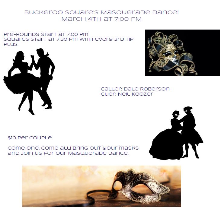 We had a good time at our 1st Saturday dance in February with about 3 squares in attendance. We are getting ready for a wonderful time Saturday February 18 at our Dance Down The Red Carpet Dance with special guest cuer Mark McDonald. Promises to be lots of fun.